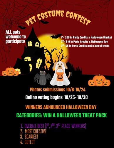 All pets big and small are welcome to come and join in on the fun for our 2025 costume contest. This years contest will award 3 main winners and 3 category winners. Don't miss out on the fun this year!